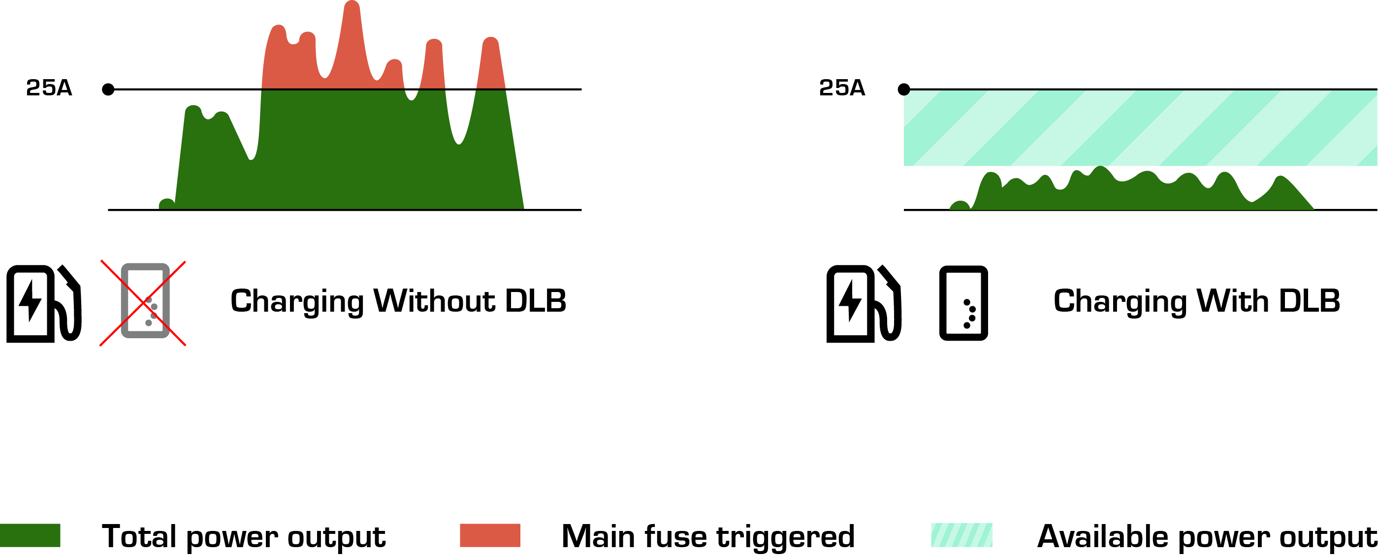 Here you will see a visual representation on how dynamic load management works, measuring real time energy demand the DLB will keep your charge point within safe optimal operating ranges.